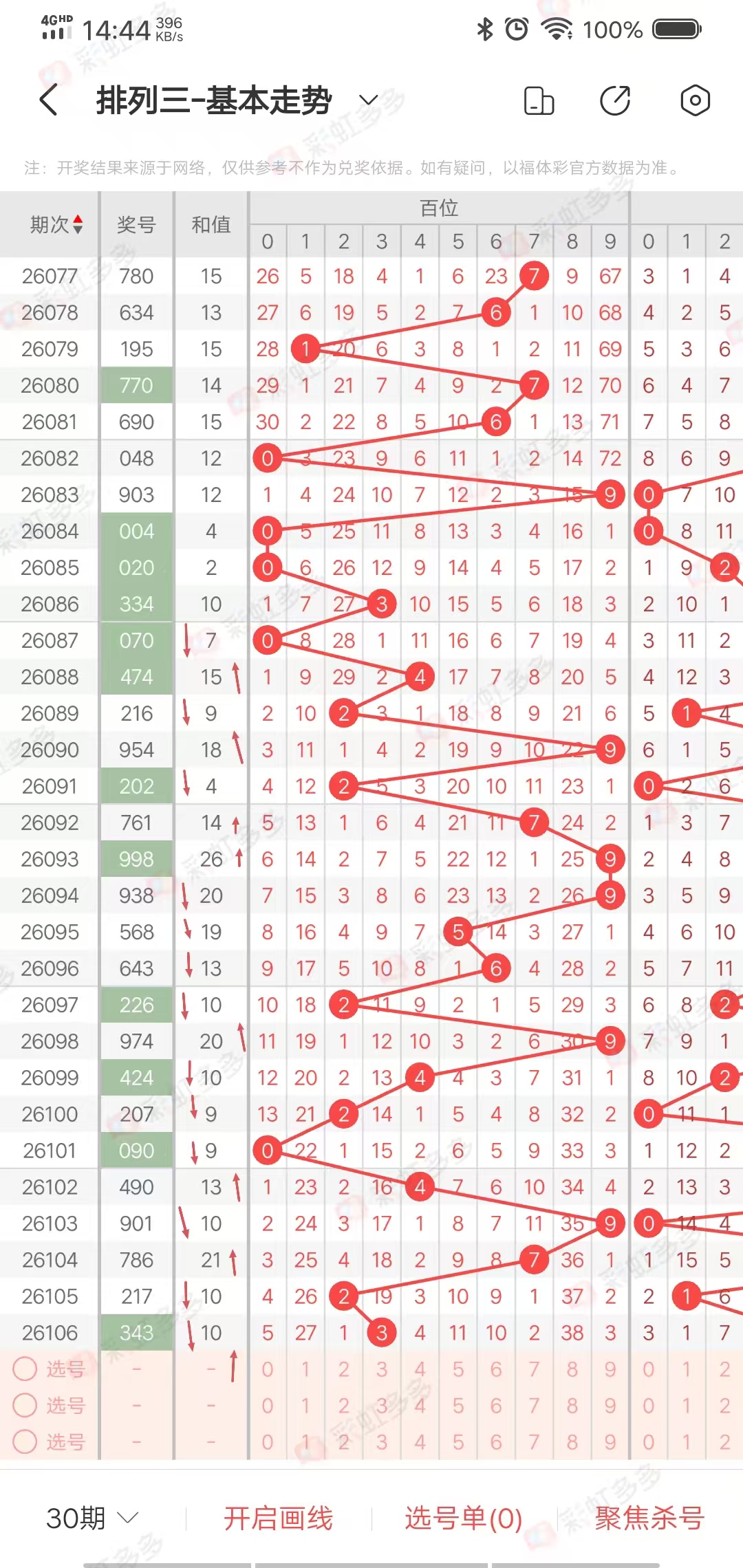 从走势图可以看出,近期和值尾上下幅度➕4-1-4-0➕2-6➕9-6-3-0-0➕9➕0-6-3➕1-1-0,近期上下幅度7,近10期多走连续上下走势,上期持平,本期有上升走势,综合和尾2486,
