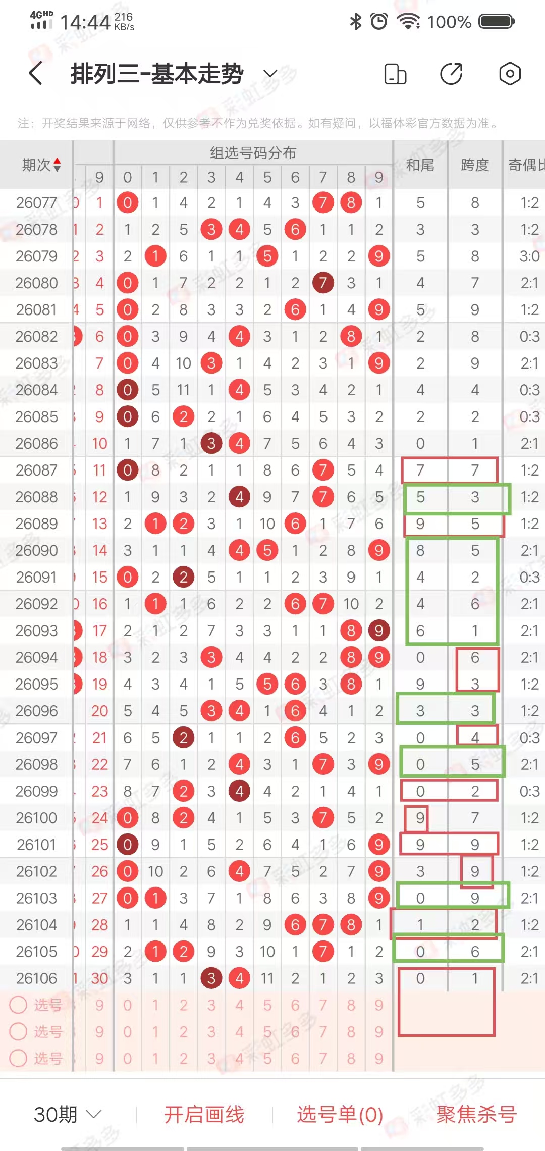 从近30期走势图,我们可以看出,上期和值尾和上期跨度,有很大概率不会出现在本期开奖号码,我们可以参考为杀号,上期和值尾出现的概率是30期出8期,出号走势为000000000011,01,00000001,0111,001,0,目前遗漏1期,出号概率较小,上期和值尾0,本期可以当作预防,1号是上期跨度,跨度出现下期的概率是10/30,出号走势为100000000001,01,000011,0001111,01,0,目前遗漏1期,出号概率较小,本期可以当作预防,两个号同时出现极少,近30期同时出现5次,作为条件01可以选择0-1个出号