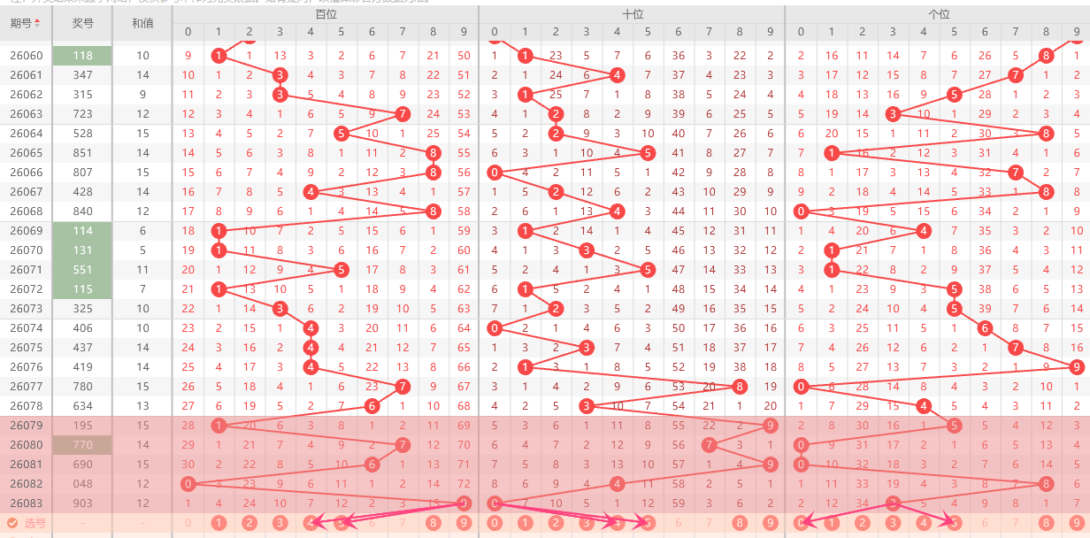 百位上期开出号码9,大数,奇数、百位近5期开出号码为:1-7-6-0-9,从近5期看79期遗漏为6,80期遗漏为2,81期遗漏为2,82期遗漏为30,83期遗漏为72,本期号码关注遗漏号码4、5,大小数走势为小大大小大,大号码走热,本期继续关注小数开出,奇偶走势为奇奇偶偶奇。奇数形态走热,注意偶数开出。本期百位推荐1-2-3-4-5-8-9,