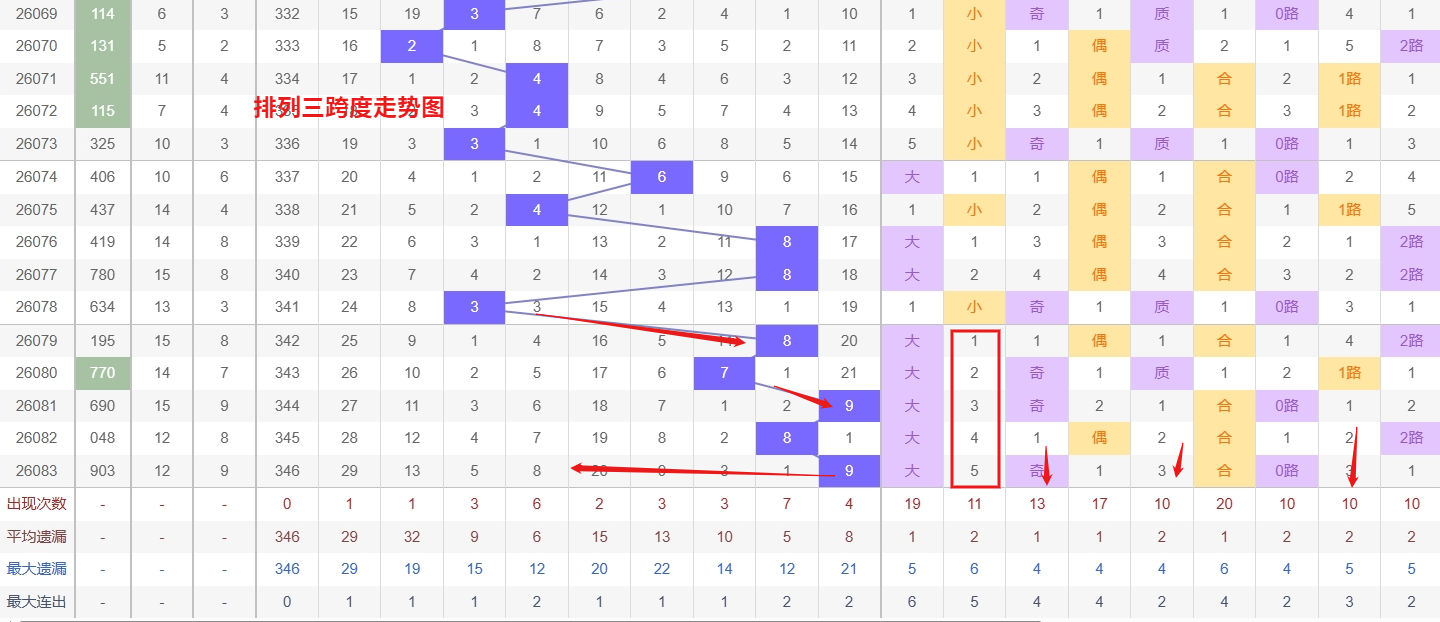 排列三 跨度分析:从上图可以看出近100期的跨度大小比约为48比52,跨度奇偶比约为45比55总体来看还是比较均衡的,但跨度大小之间有点差异。我们再从历史开出9跨后下一期7跨度数据来做参考。最近10期跨度大小比约为6:4期开出小数跨度过多返回大数跨度的概率更高一点。历史开奖近2期出9跨以后的走势为007期开出9跨后下一期走7跨走出2振幅,第024期开出9跨后下一期走3跨走6振幅第042期开出9跨后下一期开出5跨走出4振幅。连续多期大振幅,近期排列三跨度走势中,2跨作为明显的冷号,已经遗漏多期未现身,从历史冷热循环规律来看,长时间未出的跨度往往会在后续阶段出现一次回补需求,当前遗漏值已进入需要重点设防的区间,2跨的反弹可能性正在逐步积累。与此同时,7跨则处于温号状态,虽然近期表现不算特别活跃,但已出现逐步升温的迹象,出号频率有所提升,若这种势头能够延续,7跨有望从温转热,成为下一阶段的关注重点。跨度走出1到5个振幅看好的跨度有2367跨,所以第2026084期排列三跨度推荐2367跨。