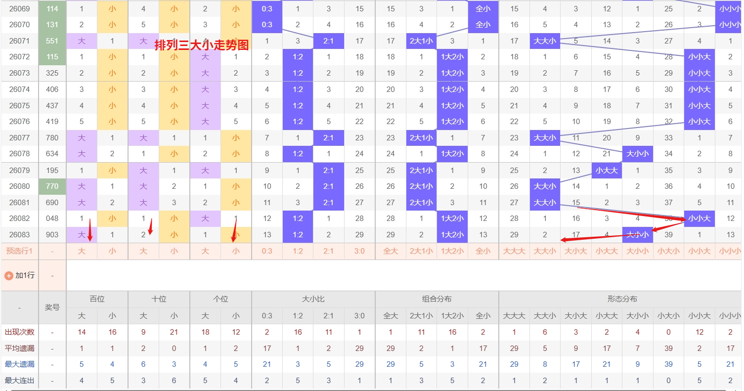 排列三 大小形态分析:从大小走势图上可以看出排列三100期内百位大小比约为45比55,十位大小比约为47:53,个位大小比约为54比46,除了个位奇数比偶数多,十位和百位偶数比奇数多。历史数据近2期开出大小小下一期的走势为,第004期开大小小后第005期开小大大。第017期开出大小小后第018期开大大大,第032期开出大小小后033期开小大小。 近期排列三大小走势中,大大大和小大大两种形态均已进入冷号状态,两者遗漏期数较长,长时间未在开奖结果中出现。从形态轮动和冷热平衡的规律来看,深度冷态往往会在后续阶段迎来一次回补释放,虽然具体哪一期反弹难以精确判断,但当前遗漏值已进入需要重点设防的区间。大大大作为全大组合,与小大大这种大小大结构虽有不同,但同属大号占优的类型,两者在冷态积累上形成共振,进一步增加了大号形态整体回补的可能性。综合来看,近期应重点关注大大大和小大大的反弹需求,所以排列三第2026084期大小形态推荐小大大防大大大。
