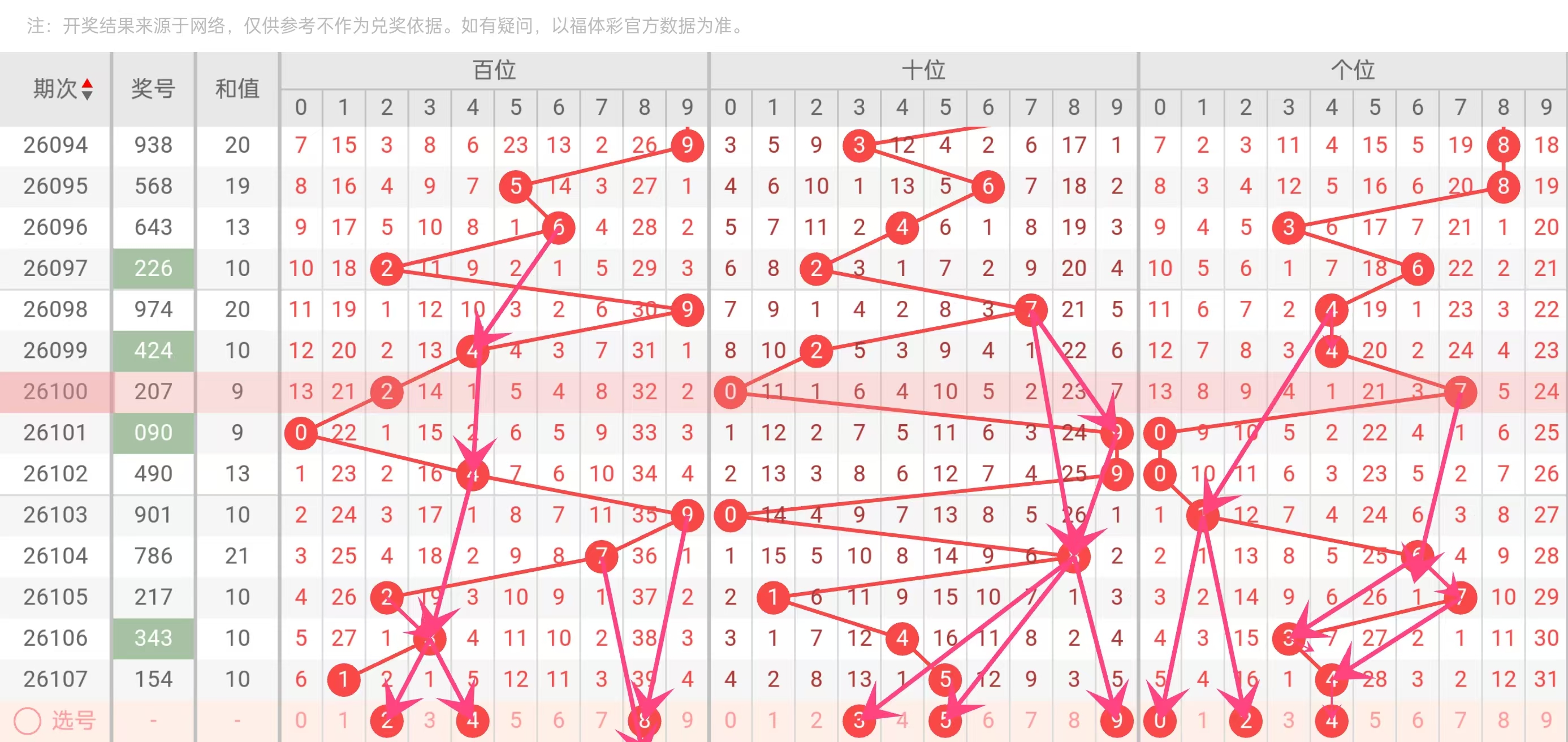 上期和值10,近10期和值振幅为:0、0、11、11、3、4、0、1、10,其中振幅0出现3次,振幅11出现2次,其余各1次,他们分别为1、3、4。最近10期和值变化平→平→降→升→降→升→平→降→降,根据近10期规律和本期振幅还是0,没完没了得,又因为近10期和值10出现5次,和值9出现2次,其余得出现1次,他们分别为13、21,综上所述本期推荐和值范围推荐为:6-25