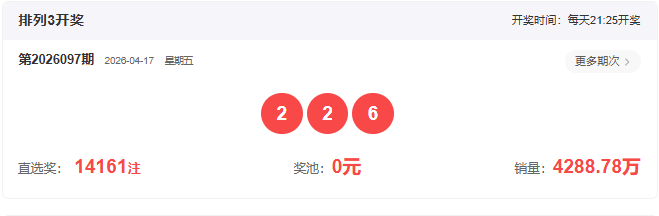 097期:上期三胆中一,银胆正确,六七码正确,五码组选中组三。单式826、026可惜了