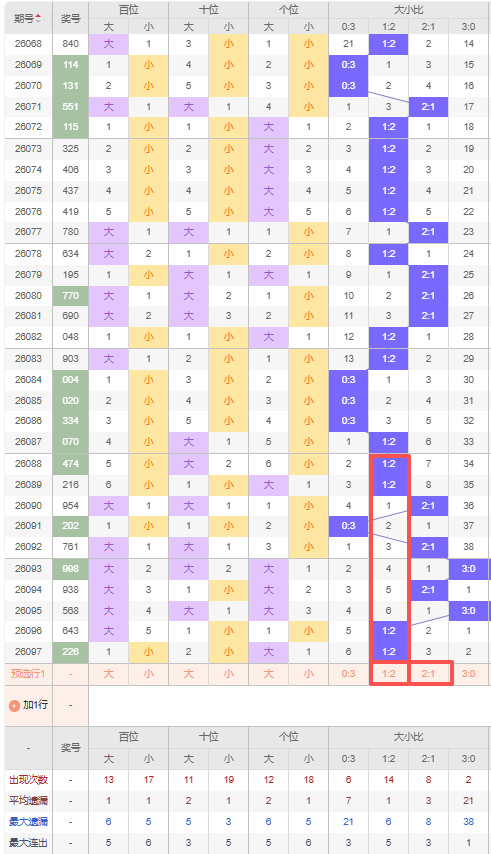 上期大小比:1:2,近10期大小比出现情况:1:2、1:2、2:1、0:3、2:1、3:0、2:1、3:0、1:2、1:2,最近10期出3期2:1,出现4期1:2,出现1期0:3,出现2期3:0,根据近10期出号规律本期推荐三连的1:2,防遗漏3期出2:1,综上所述大小比推荐:2:1,重点关注:1:2。