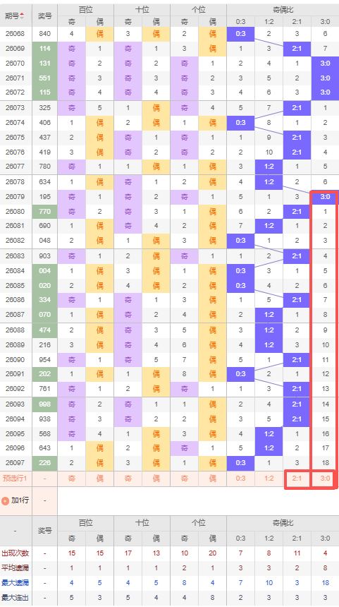 上期奇偶比:0:3,近10期奇偶比出现情况:1:2、1:2、2:1、0:3、2:1、2:1、2:1、1:2、1:2、0:3,最近10期出现4期2:1,出现4期1:2,出现2期0:3,出现0期3:0,根据近10期出号规律本期推荐遗漏3期出2:1,防遗漏18期出3:0,综上所述奇偶比推荐:3:0,重点关注:2:1。