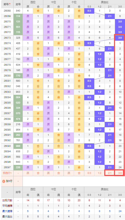 上期质合比:2:1,近10期质合比出现情况:1:2、2:1、1:2、2:1、2:1、0:3、1:2、1:2、1:2、2:1,最近10期出现4期2:1,出现5期1:2,出现1期0:3,出现0期3:0,根据近10期规律本期推荐遗漏24期出的3:0,防连出2:1,综上所述质合比推荐:2:1,重点关注:3:0。