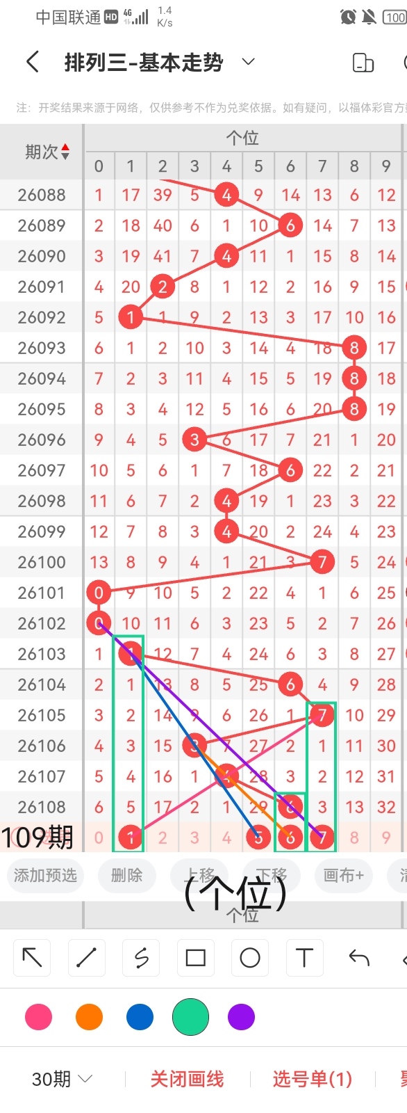 我们参照上图中画线的思路走位可以看出,号码1与前几期开出的号码呈隔五期回补的走势且呈斜三连的走位,跨度为5;遗落29期未出的号码5与前几期开出的号码呈斜三连的走势,跨度1;号码6与前几期开出的号码呈斜三连的走势且呈直连回补的走位,跨度是0;号码7与前几期开出的号码呈隔三期回补的走位且呈斜四连的走势,跨度1。综上所述,小梁推荐本期个位的号码为:1、5、6、7。
