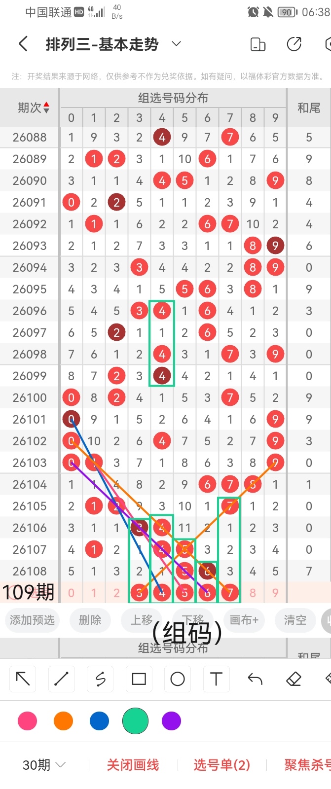 我们根据上图中画线的思路走位分析,号码0与前几期开出的号码呈斜三连的走位且呈隔七期回补的走势,跨度是6;号码3与前几期开出的号码呈斜三连的走势且呈隔两期回补的走位,跨度3;号码4与前几期开出的号码呈隔六期回补的走位且呈斜三连的走势,跨度为2;关注小梁下期不迷路。然后,如图所示,号码6与前几期开出的号码呈直连回补的走位且呈斜三连的走势,跨度0。综上所述,小梁推荐本期百位的号码为:0、3、4、6。