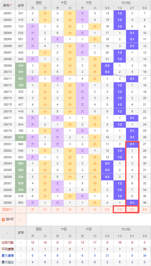 上期大小比:2:1,近10期大小比出现情况:2:1、1:2、1:2、0:3、0:3、0:3、1:2、1:2、1:2、2:1,最近10期出2期2:1,出现5期1:2,出现3期0:3,出现0期3:0,根据近10期出号规律本期推荐连出2:1,防隔期出1:2,综上所述大小比推荐:1:2,重点关注:2:1。