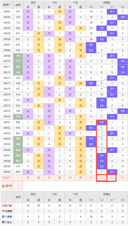 上期奇偶比:2:1,近10期奇偶比出现情况:1:2、0:3、2:1、0:3、0:3、2:1、1:2、1:2、1:2、2:1,最近10期出现3期2:1,出现4期1:2,出现3期0:3,出现0期3:0,根据近10期出号规律本期推荐隔期出1:2,防连出2:1,综上所述奇偶比推荐:2:1,重点关注:1:2。