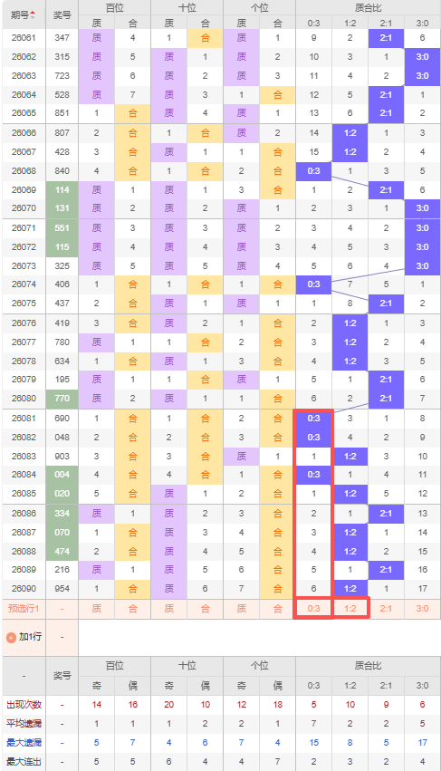 上期质合比:1:2,近10期质合比出现情况:0:3、0:3、1:2、0:3、1:2、2:1、1:2、1:2、2:1、1:2,最近10期出现2期2:1,出现5期1:2,出现3期0:3,出现0期3:0,根据近10期规律本期推荐连出的1:2,防遗漏6期出0:3,综上所述质合比推荐:0:3,重点关注:1:2。