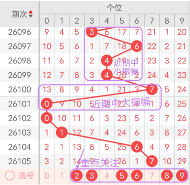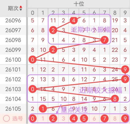 近7期(099~105)开奖号十位号码球分别为2、0、9、9、0、8、1,开奖号与上一期走出的振幅分别为5、2、9、0、9、8、7。099期走出2号小数号码球,走出“5”的中大幅度,100期走出0号小数号码球,走出“2”的小幅度,101期走出9号大数号码球,走出“9”的小幅度,102期走出9号大数号码球,走出“0”的小幅度,103期走出9号大数号码球,走出“9”的大幅度,104期走出8号大数号码球,走出“8”的大幅度,105期走出1号小数号码球,走出“7”的大幅度;从振幅大小及走势图的整体对应来看,中大振幅走在6~8之间较为适宜,中小振幅走在1~4之间较为适宜;结合走势图的上下对应及振幅大小分析,本期十位应重点关注号码球为0、2、4、5、7、9。