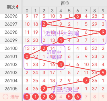 近7期(099~105)开奖号百位号码球分别为4、2、0、4、9、7、2,开奖号与上一期走出的振幅分别为5、2、2、4、5、2、5。099期走出4号中小数号码球,走出“5”的中大幅度,100期走出2号小数号码球,走出“2”的小幅度,101期走出0号小数号码球,走出“2”的小幅度,102期走出4号中小数号码球,走出“4”的中小幅度,103期走出9号大数号码球,走出“5”的中大幅度,104期走出7号大数号码球,走出“2”的小幅度,105期走出2号小数号码球,走出“5”的中大幅度;从振幅大小及走势图的整体形势来看,中大幅度走在3~4之间较为适宜,中小幅度走在0~2之间较为适宜;结合走势图的整体及大小走势分析,本期百位需重点关注号码球为0、1、2、3、5、6。