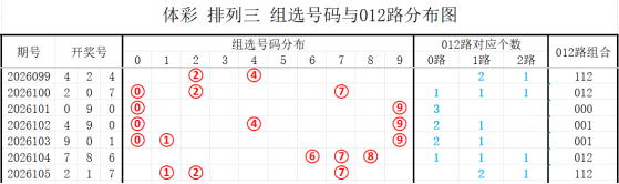 近7期(099~105)开奖号与012路组合分别为424(112)、207(012)、090(000)、490(001)、901(001)、786(012)、217(112),上期开奖号为112路组合,根据整体走势分析,本期看好的012路组合有:012、002、002,防022、112、122路组合。