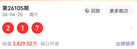 2026105期开奖号码为217,奇偶值为1偶2奇;大小值为1大2小;012路走势为112路;跨度为6跨;和值10点;组六形态。