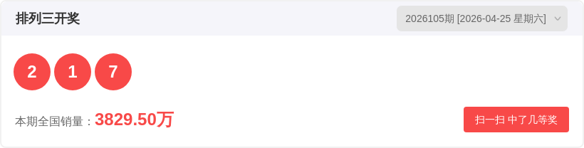 排列326105期开奖结果2 1 7,012路比0:2:1,质合比3:0,大小比1:2,和值10。