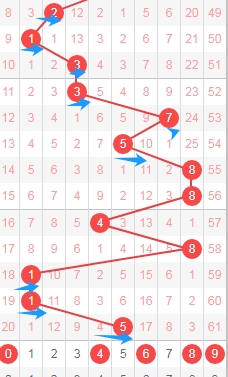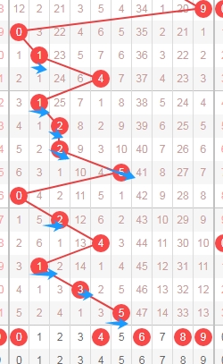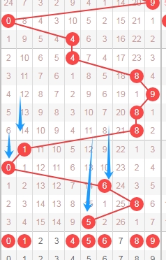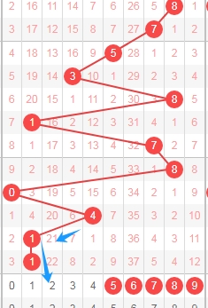 上图是体彩排列五从左到右定位第三位数字走势图,我标注出来的蓝色小箭头表示走势跨度,上期是数字1重复那就是跨度为0,看这些蓝色小箭头最近开出都是小跨度,那么本期可以关注出大跨度的数字56789,个人最看好数字568。