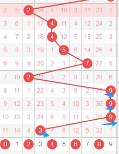 上图是体彩排列五从左到右定位第二位数字走势图,我标注出来的蓝色小箭头表示的都是质数数字,上面标注出来的蓝色小箭头也是质数数字,那么本期可以关注出合数数字04689,个人最看好数字4689。