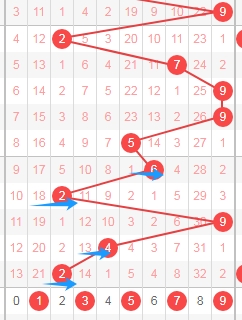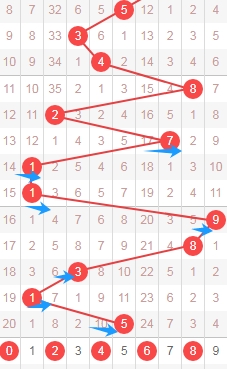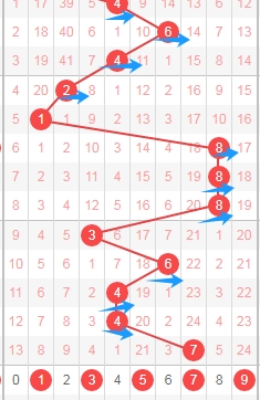 上图是体彩排列五从左到右定位第二位数字,我标注出来的蓝色箭头表示偶数数字,最近几期开出偶数数字比较多,那么本期第尔位数字可以关注出奇数数字13579,个人最看好数字1379。