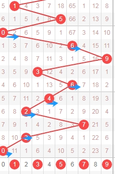 上图是体彩排列五从左到右定位第一位数字,我标注出来的蓝色箭头表示偶数数字,最近5期开出了4期偶数数字,那么本期第一位数字可以关注出奇数数字13579,个人最看好数字1359。