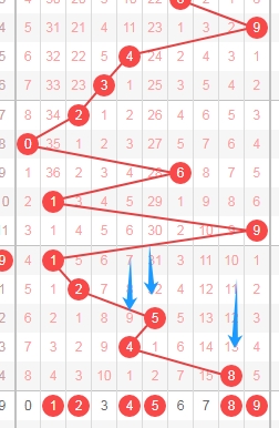 上图是体彩排列五从左到右定位第五位数字,我标注出来的蓝色箭头表示遗漏周期,上期开出数字8遗漏周期是13期,上上期开出数字4遗漏周期是9期,那么本期第五位数字可以关注出遗漏周期小的数字124589,个人最看好数字12459。