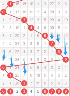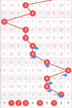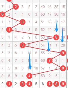 上图是体彩排列五从左到右定位第四位数字,我标注出来的蓝色箭头表示遗漏周期,上期开出数字3遗漏周期是7期,看蓝色小箭头都是遗漏周期大的数字,那么本期可以关注遗漏周期小的数字0136789,个人最看好数字0139。