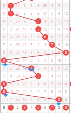 上图是体彩排列五从左到右定位第三位数字,我标注出来的蓝色箭头表示偶数数字,最近又连续开出了3期偶数数字,那么本期第三位数字可以关注出奇数数字13579,个人最看好数字1579。