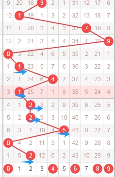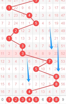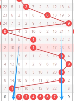 上图是体彩排列五从左到右定位第一位数字走势图,我标志出来的蓝色箭头都是遗漏周期,上期开出数字4遗漏周期是9期,根据这些遗漏周期分析,本期第一位数字可以关注遗漏周期小的数字1234578,个人最看好数字1578。