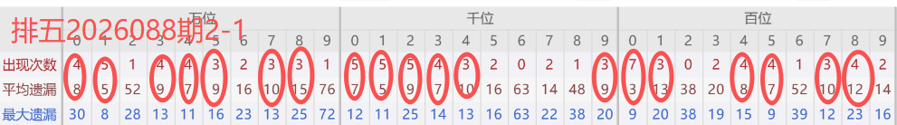 下图所圈出的为近30期各位置所出现的热码出现次数及平均遗漏值,用以参考和一些冷码组合选号。