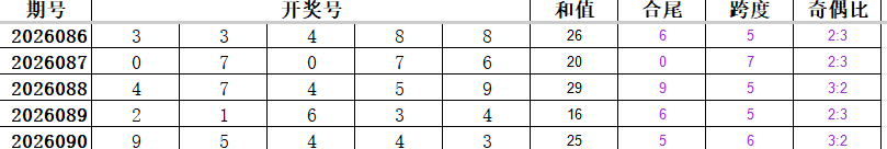- 和值:所有数字相加总和25;- 合尾:5;- 跨度:6;- 奇偶比:3:2。