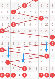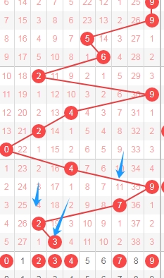 上图是体彩排列五从左到右定位第一位数字,我标注出来的蓝色箭头表示遗漏周期,上期开出数字3遗漏周期是19期,那么本期可以关注遗漏周期小的数字023479,个人最看好数字02479。