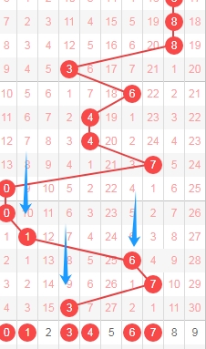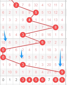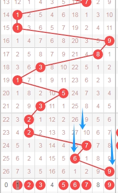 上图是体彩排列五从左到右定位第四位数字,我标注出来的蓝色箭头表示遗漏周期,上期开出数字9遗漏周期是9期,上上期开出数字6遗漏周期是28期,那么本期可以关注出遗漏周期小的数字1235679,个人最看好数字23567。