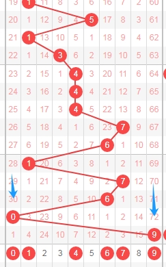上图是体彩排列五从左到右定位第一位数字,我标注出来的蓝色小箭头表示遗漏周期,上期开出数字9遗漏周期是72期,那么本期可以关注出遗漏周期小的数字014679,个人最看好数字0679。
