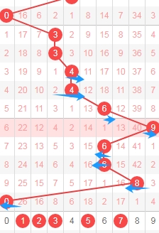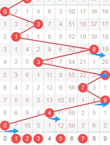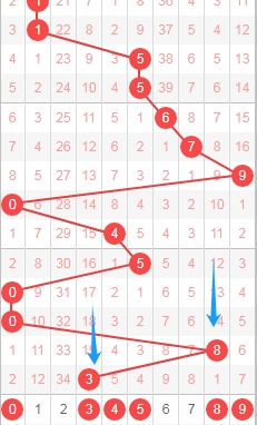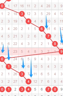 上图是体彩排列五从左到右定位第四位数字,我标注出来的蓝色小箭头表示遗漏周期,根据上面的蓝色小箭头来分析的话,本期第三位数字关注遗漏周期小的数字013478,个人最看好数字0178。