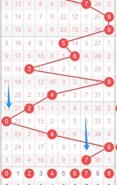 上图是体彩排列五从左到右定位第一位数字,我标注出来的蓝色箭头表示遗漏周期,上期开出数字7遗漏周期是11期,根据最近几期遗漏周期来分析的话,本期体彩排列五第一位数字可以关注出遗漏周期小的数字024679,个人最看好数字04679。