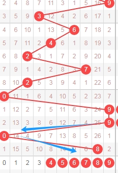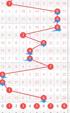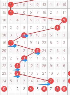 上图是体彩排列五从左到右定位第三位数字,我标注出来的蓝色箭头表示偶数数字,很明显最近十几期开出的偶数数字多,那么本期第三位数字可以关注出奇数数字13579,个人最看好数字3579。
