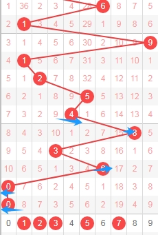 上图是体彩排列五从左到右定位第二位数字,我标注出来的蓝色箭头表示走势跨度,很明显最近两期的跨度大,那么本期可以关注走势跨度小的数字456789,个人最看好数字45789。