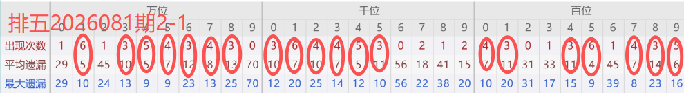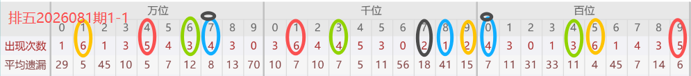 下图所圈出的为近30期各位置所出现的热码出现次数及平均遗漏值,用以参考和一些冷码组合选号。