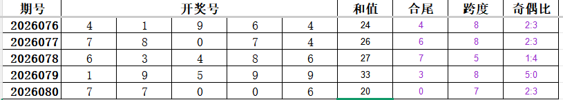 - 和值:所有数字相加总和20;- 合尾:0;- 跨度:7;- 奇偶比:2:3。