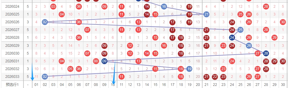 上图是福彩七乐彩开奖号码走势分布图,我标注出来的蓝色箭头中间这个区域的数字一共有10个,本期可以关注这个区域的数字出3个或者4个吧。