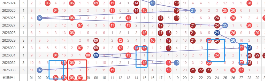 上图是福彩七乐彩开奖号码走势分布图,我标注出来的蓝色框框和红色框框,你们看这些框框都是相同的图形,都是隔一期数字出连号的图形,像14 15连号其中数字15是隔一期的,那么本期可以考虑05隔一期出连号0405,或者06隔一期出连号0607。