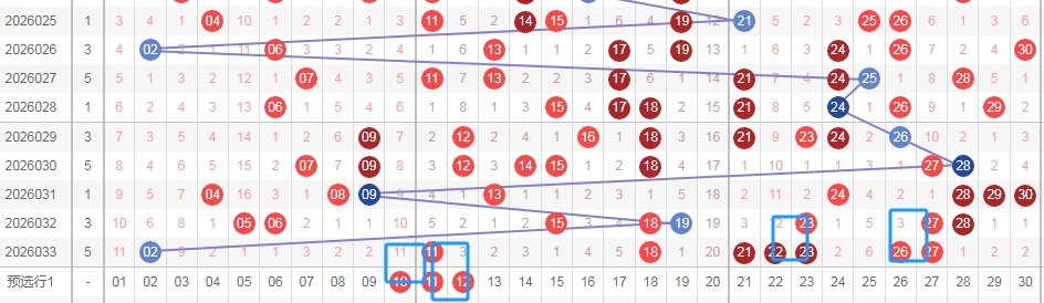 上图是福彩七乐彩开奖号码走势分布图,我标注出来的蓝色框框,你们看这些框框都是相同的图形,都重复号码数字出连号的图形,像上期号码23重复号码带出连号2223,上期号码27重复后带出连号2627,那么上期数字11后面可以考虑连号1011或者1112。