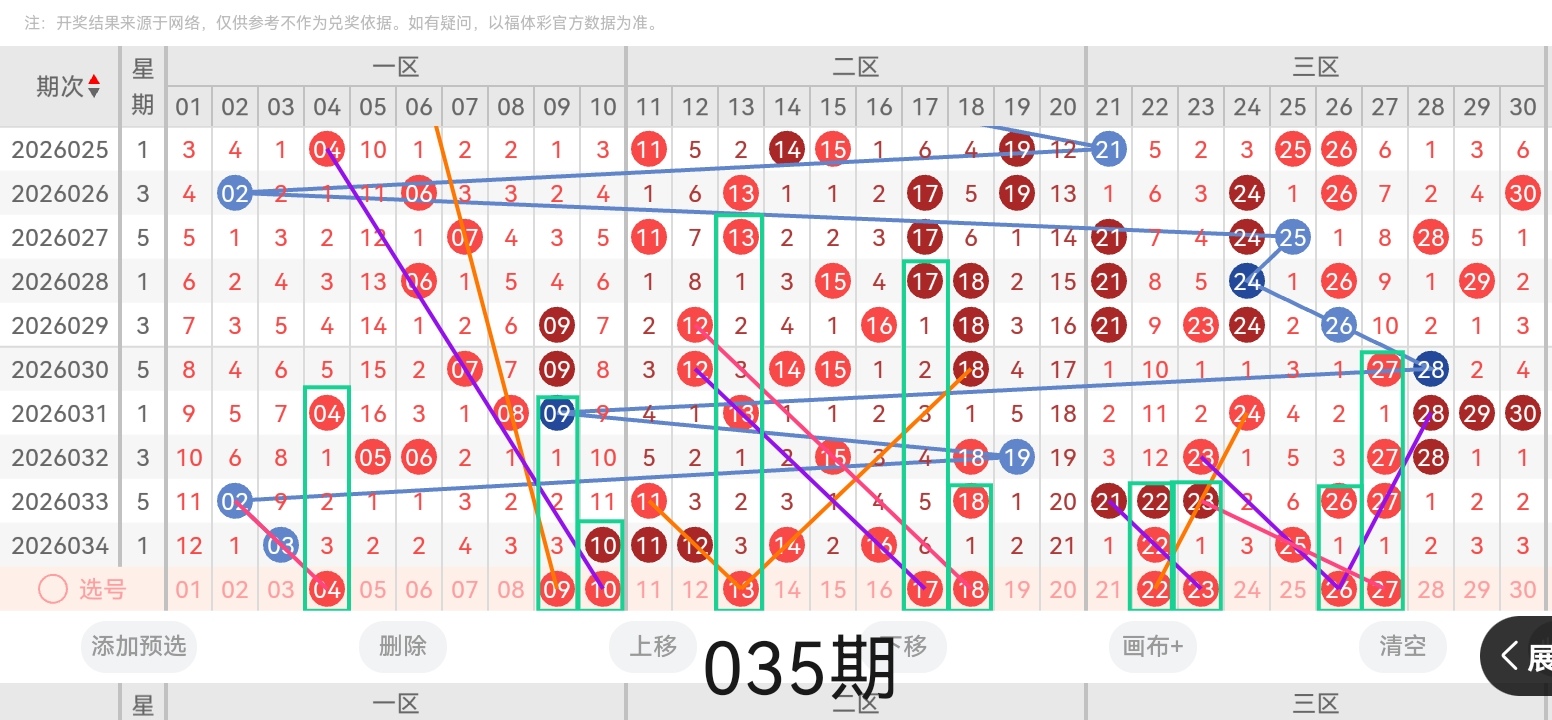 通过对上期的开奖号码简单回顾,下面进入七乐彩第2026035期(下面简称本期)的选号分析: