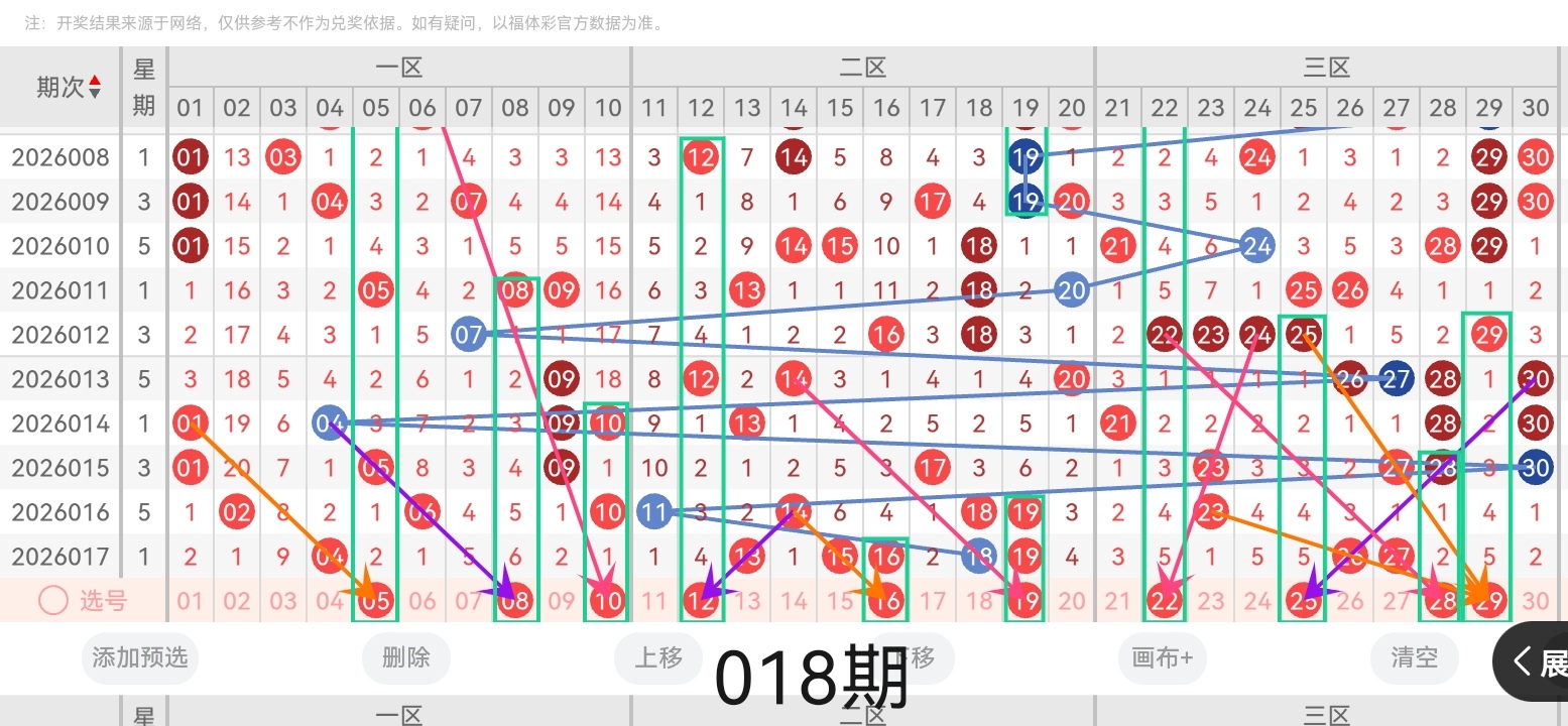 通过对上期的开奖号码简单回顾,下面进入七乐彩第2026018期(下面简称本期)的选号分析: