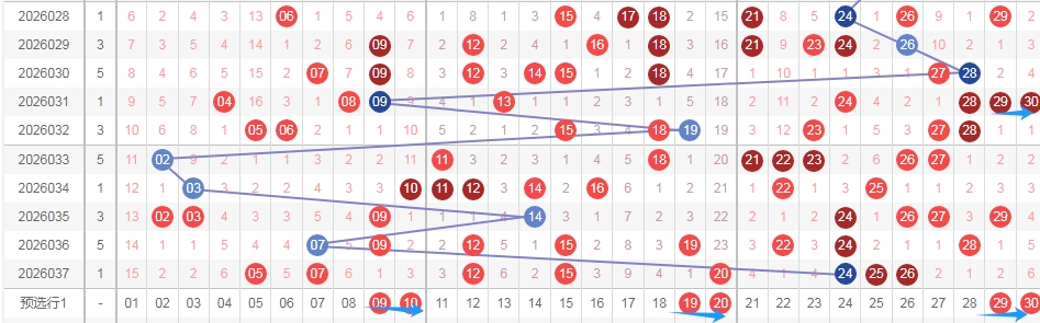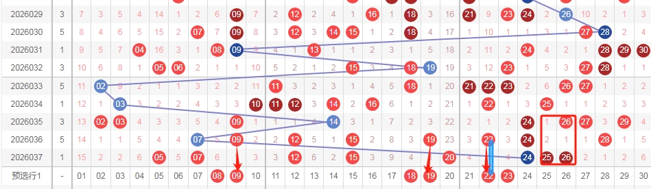 上图是福彩七乐彩开奖号码走势分布图,我标注出来的数字0809 1819 2223都是连号组合,你们看上期开出的连号组合2526其中数字26是隔一期的,你们看我标注出来的红色框框就知道了,那么假设本期继续这样走的话,那么隔一期的数字出连号组合,可以考虑0809或者1819还有2223因为这三组连号都有隔一期的数字。