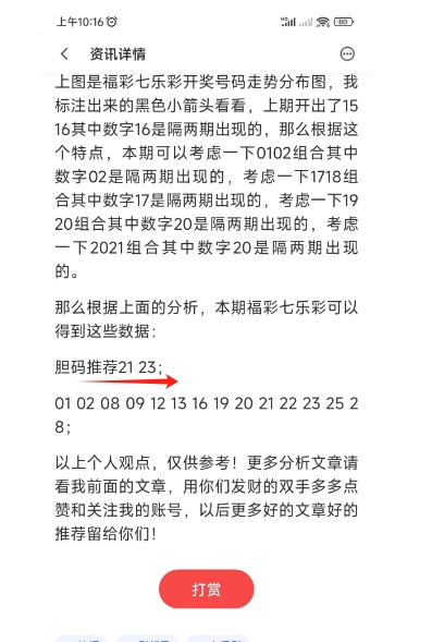 上图是上期福彩七乐彩号码分析文章截图,我最后推荐的胆码是21 23,开奖号码有21 22,这个你们去看上期的号码分析文章吧。