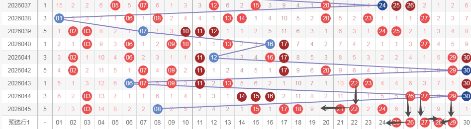 上图是福彩七乐彩开奖号码走势分布图,我标注出来的蓝色箭头看看,根据最近开奖号码特点来选择号码,上期开出了连号组合21 22其中数字22是隔一期的,那么根据这个特点,本期可以考虑一下连号组合2526其中数字26是隔一期的,还可以考虑连号组合2728其中数字27是隔一期的,还可以考虑连号组合2829其中数字29是隔一期的,你们看上面我走势图中标注出来的黑色小箭头吧。