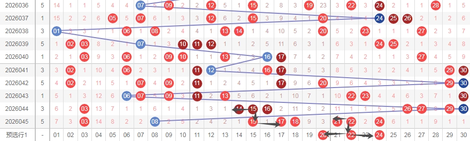 上图是福彩七乐彩开奖号码走势分布图,我标注出来的蓝色箭头看看,根据最近开奖号码特点来选择号码,上期开出了跨度二组合15 17其中数字15是重复号码而且是连号1415重复号码,那么根据这个特点,上期开出了连号组合2122本期可以考虑跨度二组合2022其中数字22是重复的,还可以考虑跨度二组合2024其中数字22是重复的。