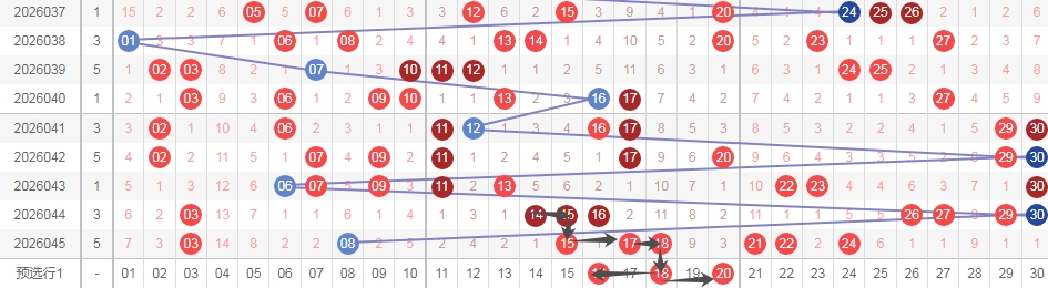 上图是福彩七乐彩开奖号码走势分布图,我标注出来的蓝色箭头看看,根据最近开奖号码特点来选择号码,上期开出了跨度二组合15 17其中数字15是重复号码而且是连号1415重复号码,那么根据这个特点,上期开出了连号组合1718本期可以考虑跨度二组合1618其中数字18是重复的,还可以考虑跨度二组合1820其中数字18是重复的。