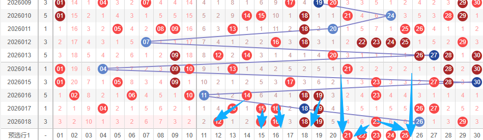 上图是福彩七乐彩开奖号码走势分布图,我在上面走势图中标注出来的数字21 22 23 24 25个人觉得这个区域的数字本期至少要出1个或者2个吧,你们看看上面标注出现的蓝色小箭头,最近开出的号码都是斜连号码或者重复号码,上期开出的数字23没斜连号也没重复号码,那么本期就关注数字23附近出号码,关注数字21 22 23 24 25出1个或者2个吧。